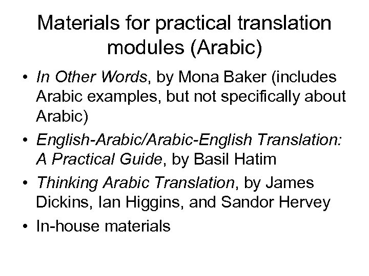 Materials for practical translation modules (Arabic) • In Other Words, by Mona Baker (includes Arabic examples, but not specifically about Arabic) • English-Arabic/Arabic-English Translation: A Practical Guide, by Basil Hatim • Thinking Arabic Translation, by James Dickins, Ian Higgins, and Sandor Hervey • In-house materials