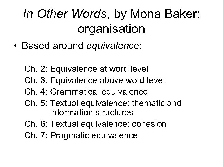 In Other Words, by Mona Baker: organisation • Based around equivalence: Ch. 2: Equivalence at word level Ch. 3: Equivalence above word level Ch. 4: Grammatical equivalence Ch. 5: Textual equivalence: thematic and information structures Ch. 6: Textual equivalence: cohesion Ch. 7: Pragmatic equivalence