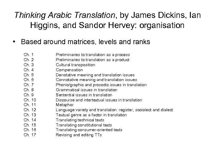 Thinking Arabic Translation, by James Dickins, Ian Higgins, and Sandor Hervey: organisation • Based around matrices, levels and ranks Ch. 1 Ch. 2 Ch. 3 Ch. 4 Ch. 5 Ch. 6 Ch. 7 Ch. 8 Ch. 9 Ch. 10 Ch. 11 Ch. 12 Ch. 13 Ch. 14 Ch. 15 Ch. 16 Ch. 17 Preliminaries to translation as a process Preliminaries to translation as a product Cultural transposition Compensation Denotative meaning and translation issues Connotative meaning and translation issues Phonic/graphic and prosodic issues in translation Grammatical issues in translation Sentential issues in translation Discourse and intertextual issues in translation Metaphor Language variety and translation: register, sociolect and dialect Textual genre as a factor in translation Translating technical texts Translating constitutional texts Translating consumer-oriented texts Revising and editing TTs