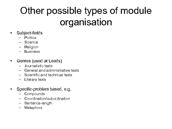 Other possible types of module organisation • Subject-fields – – • Genres (used at Leeds) – – • Politics Science Religion Business Journalistic texts General and administrative texts Scientific and technical texts Literary texts Specific-problem based, e. g. – – Compounds Coordination/subordination Sentence-length Metaphors