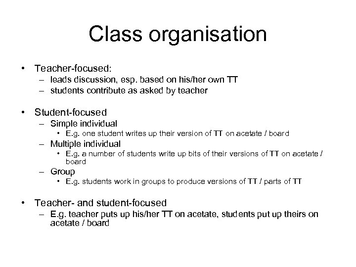 Class organisation • Teacher-focused: – leads discussion, esp. based on his/her own TT – students contribute as asked by teacher • Student-focused – Simple individual • E. g. one student writes up their version of TT on acetate / board – Multiple individual • E. g. a number of students write up bits of their versions of TT on acetate / board – Group • E. g. students work in groups to produce versions of TT / parts of TT • Teacher- and student-focused – E. g. teacher puts up his/her TT on acetate, students put up theirs on acetate / board
