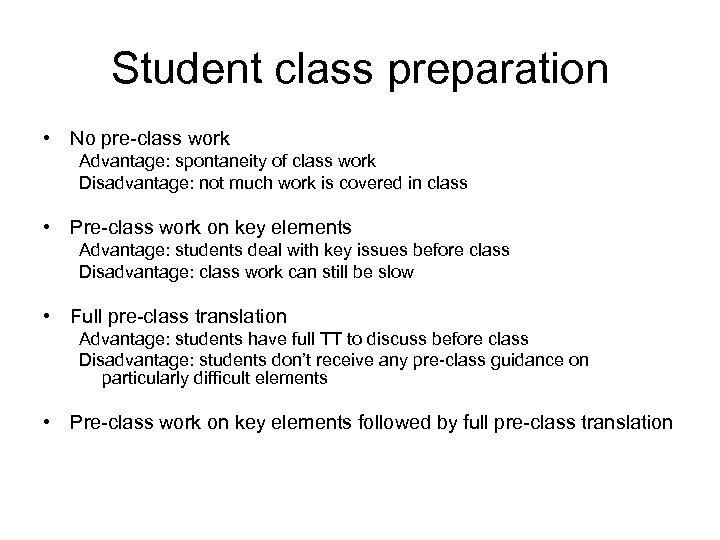Student class preparation • No pre-class work Advantage: spontaneity of class work Disadvantage: not much work is covered in class • Pre-class work on key elements Advantage: students deal with key issues before class Disadvantage: class work can still be slow • Full pre-class translation Advantage: students have full TT to discuss before class Disadvantage: students don’t receive any pre-class guidance on particularly difficult elements • Pre-class work on key elements followed by full pre-class translation