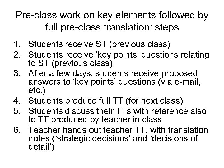 Pre-class work on key elements followed by full pre-class translation: steps 1. Students receive ST (previous class) 2. Students receive ‘key points’ questions relating to ST (previous class) 3. After a few days, students receive proposed answers to ‘key points’ questions (via e-mail, etc. ) 4. Students produce full TT (for next class) 5. Students discuss their TTs with reference also to TT produced by teacher in class 6. Teacher hands out teacher TT, with translation notes (‘strategic decisions’ and ‘decisions of detail’)