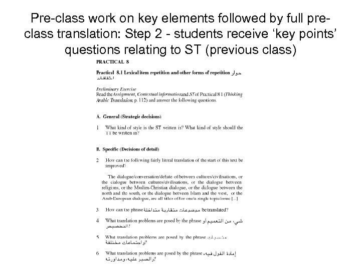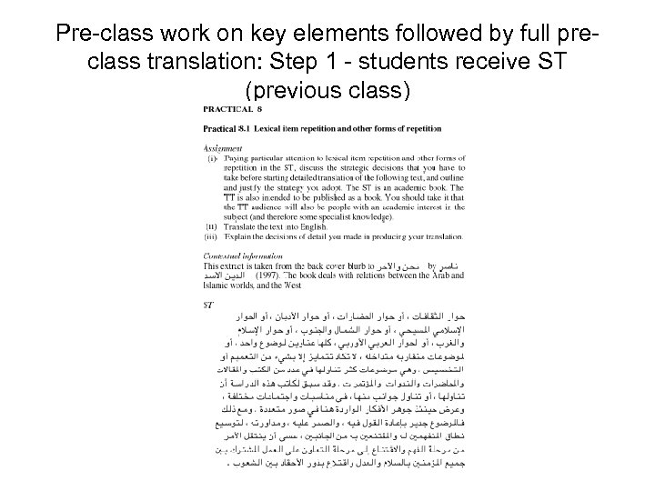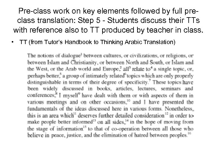Pre-class work on key elements followed by full preclass translation: Step 5 - Students discuss their TTs with reference also to TT produced by teacher in class. • TT (from Tutor’s Handbook to Thinking Arabic Translation)