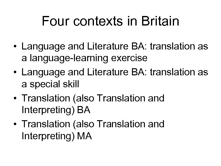 Four contexts in Britain • Language and Literature BA: translation as a language-learning exercise • Language and Literature BA: translation as a special skill • Translation (also Translation and Interpreting) BA • Translation (also Translation and Interpreting) MA
