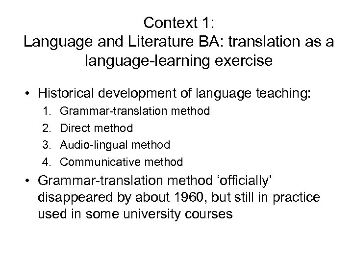 Context 1: Language and Literature BA: translation as a language-learning exercise • Historical development of language teaching: 1. 2. 3. 4. Grammar-translation method Direct method Audio-lingual method Communicative method • Grammar-translation method ‘officially’ disappeared by about 1960, but still in practice used in some university courses