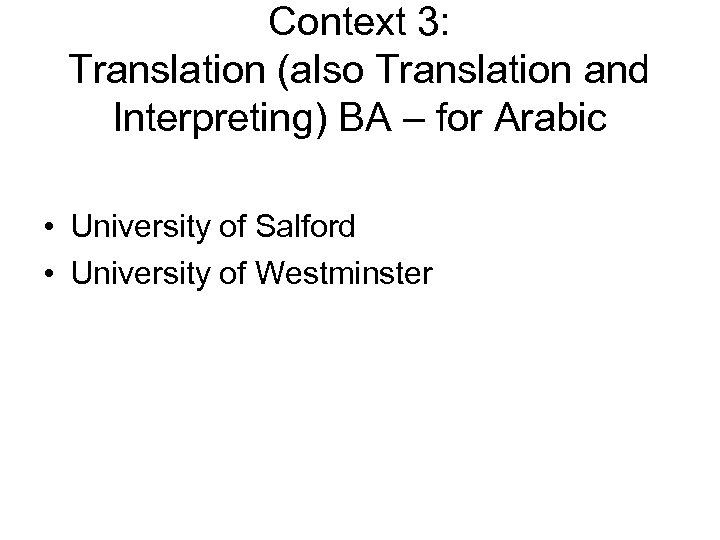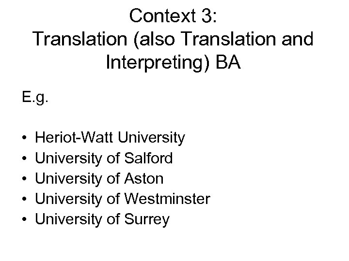 Context 3: Translation (also Translation and Interpreting) BA E. g. • • • Heriot-Watt University of Salford University of Aston University of Westminster University of Surrey