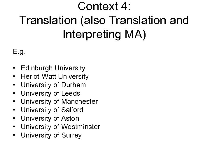 Context 4: Translation (also Translation and Interpreting MA) E. g. • • • Edinburgh University Heriot-Watt University of Durham University of Leeds University of Manchester University of Salford University of Aston University of Westminster University of Surrey