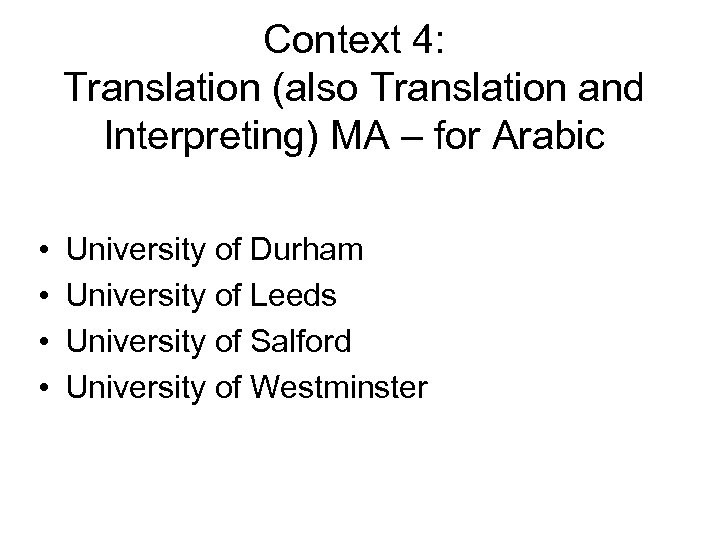 Context 4: Translation (also Translation and Interpreting) MA – for Arabic • • University of Durham University of Leeds University of Salford University of Westminster