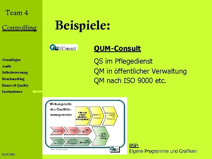 Team 4 Controlling Beispiele: QUM-Consult Grundlagen Audit Selbstbewertung Benchmarking House of Quality QS im Pflegedienst QM in öffentlicher Verwaltung QM nach ISO 9000 etc. Institutionen 20. 07. 2001 BSP: Eigene Programme und Grafiken