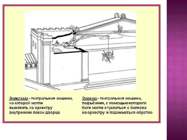 Театрон – это места для почётных зрителей. Орхестра – круглая или полукруглая площадка, на которой выступали актёры и хор. Скене – пристройка, примыкавшая к орхестре. К её стене прикрепляли полотнища, изображавшие то вход во дворец, то берег моря. Внутри скене хранились костюмы и маски актёров.