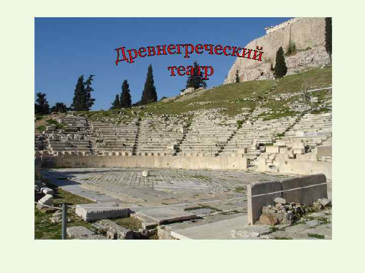 ТЕАТР - (греч. θέατρον —место ТЕАТР для зрелищ) — одно из направлений искусства, в котором чувства, мысли и эмоции автора передаются зрителю посредством действий группы актёров