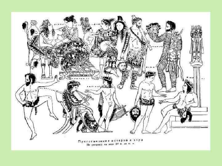 В VI веке до нашей эры на возвышенной части Афин была построена площадка для песен и плясок в честь Диониса. Во время празднеств, которые назывались великие Дионисии, выступали хоры наряженных в козьи шкуры певцов и исполняли особые гимны (хвалебные песни) — дифирамбы. Начинал запевала, ему отвечал хор. Пение сопровождалось пляской. Из этих гимнов родилась трагедия (слово можно перевести как „песнь козлов“). На сельских же празднествах в честь Диониса исполнялись шуточные песни, которые тоже начинал запевала и они сопровождались произошла Греческие актеры с театральными масками. Фрагмент росписи краснофигурной вазы. V в. до н. э. плясками — от них комедия.