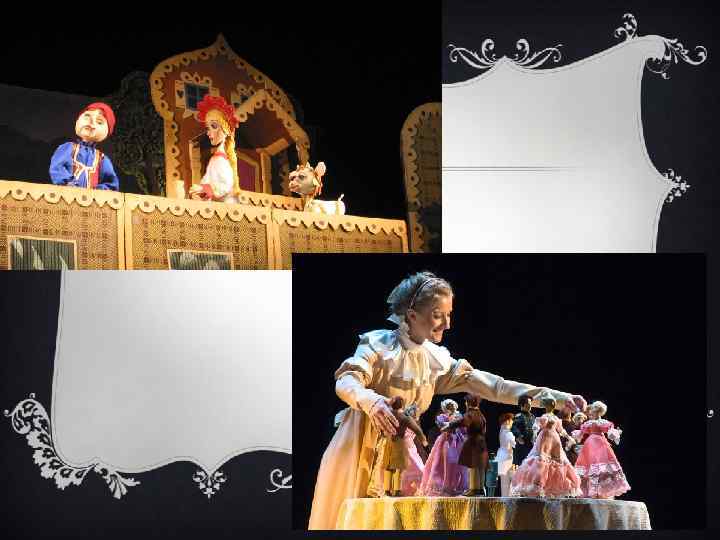 v 4) Кукольный театр Теа тр кукол — одна из разновидностей кукольного вида пространственно-временнóго искусства, в который входят мультипликационное и немультипликационное анимационное киноискусство, кукольное искусство эстрады и художественные кукольные программы телевидения. В спектаклях театра кукол внешность и физические действия персонажей изображаются и/или обозначаются, как правило, объёмными, полу объёмными и плоскими куклами. Куклы-актёры обычно управляются и приводятся в движение людьми, актёрами-кукловодами, а иногда автоматическими механическими или механически-электрически- электронными устройствами. В последнем случае куклы-актёры называются куклами-роботами. Среди театров кукол различают три основных типа: 1. Театр верховых кукол, управляемых снизу. Актёры-кукловоды в театрах этого типа обычно скрыты от зрителей ширмой, но бывает и так, что они не скрываются и видны зрителям целиком или на половину своего роста. 2. Театр низовых кукол (кукол-марионеток), управляемых сверху с помощью ниток, прутов или проволоками. Актёры-кукловоды в театрах этого типа чаще всего тоже скрыты от зрителей, но не ширмой, а верхней занавеской или падугой. В некоторых случаях актёры-кукловоды, как и в театрах верховых кукол, видны зрителям целиком или на половину своего роста. 3. Театр срединных кукол, управляемых на уровне актёров-кукловодов.