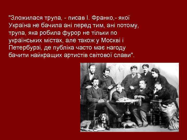 "Зложилася трупа, - писав І. Франко, - якої Україна не бачила ані перед тим, ані потому, трупа, яка робила фурор не тільки по українських містах, але також у Москві і Петербурзі, де публіка часто має нагоду бачити найкращих артистів світової слави".