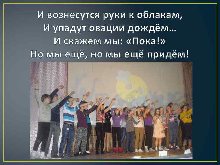 И вознесутся руки к облакам, И упадут овации дождём… И скажем мы: «Пока!» Но мы ещё, но мы ещё придём!