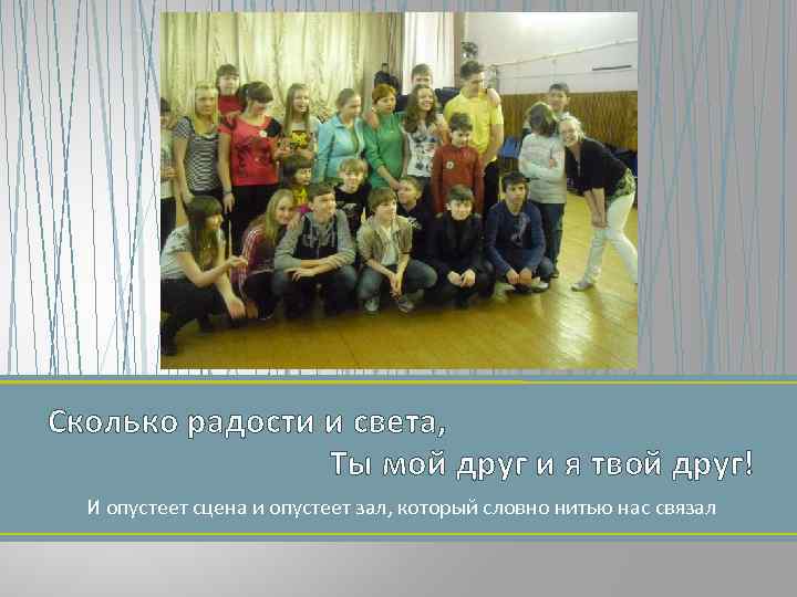 Сколько радости и света, Ты мой друг и я твой друг! И опустеет сцена и опустеет зал, который словно нитью нас связал