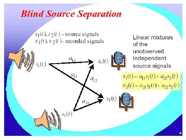 Blind Source Separation The blind source separation problem is to extract the underlying source signals from a set of linear mixtures, where the mixing matrix is unknown. This situation is common in acoustics, radio, medical signal and image processing, hyperspectral imaging, etc.