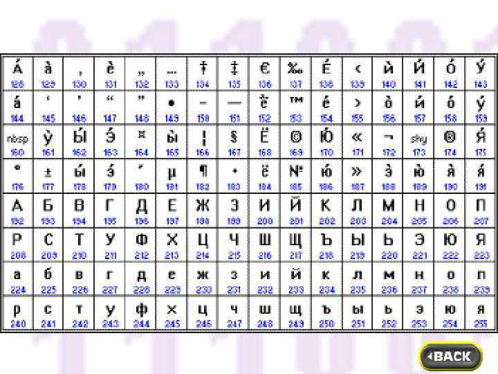 Коды со 128 по 255 являются национальными, т. е. в национальных кодировках одному и тому же коду соответствуют различные символы. В настоящее время существует пять различных кодовых таблиц для кодирования русских букв: KOI 8 -R, CP 1251, Mac, ISO, Unicode Примеры кодовых таблиц для кодирования русских букв: KOI 8 -R CP 1251