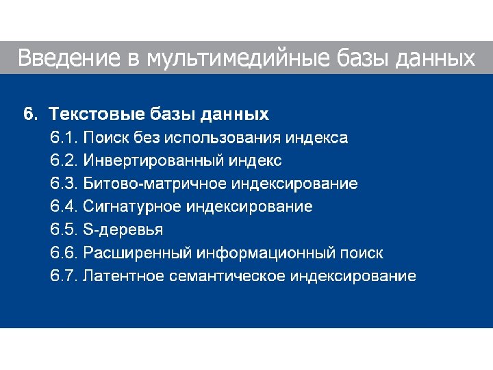 Текстовые базы данных • • Содержат текстовую информацию/текстовые документы Наиболее распространенные на сегодняшний день «Зрелый» уровень развития; «первые шаги» в 60 -70 -х годах Существует условное разбиение: • • • Структурированные (structured) бд: форматированные записи, объект задается структурой Неструктурированные (unstructured) бд: например, полные тексты статей Полуструктурированные (semi-structured) данные: (веб-страницы, XML-документы) • «Зрелый» уровень развития; «первые шаги» в 60 -70 -х годах • Области применения: • • • Электронный документооборот (автоматизация офиса) Цифровые библиотеки Юридические и патентные системы Электронные словари/энциклопедии/справочники Электронные газеты/журналы/книги Библиотеки исходников программного обеспечения (source program libraries) 125