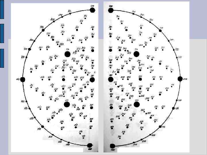Прямая полюсная фигура Гномостереографическая проекция плоскостей {hkl} во всех зернах поликристаллического образца, называемая прямой полюсной фигурой (ППФ), отражает ориентацию кристаллов в образце и является универсальным методом анализа текстур. При построении ППФ принимаются такие условия: - отображается проекция полюсов одного семейства плоскостей {hkl}, чаще всего {100}; для этого регистрируется интерференционное кольцо 200, имеющееся на дифракционных картинах ОЦК и ГЦК кристаллов; - на гномостереографической проекции не изображается каждый полюс в отдельности, штрихуются те места, на которые проектируются достаточно «густонаселенные» участки сферы проекции.
