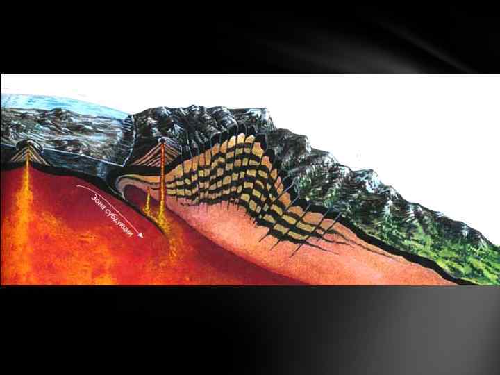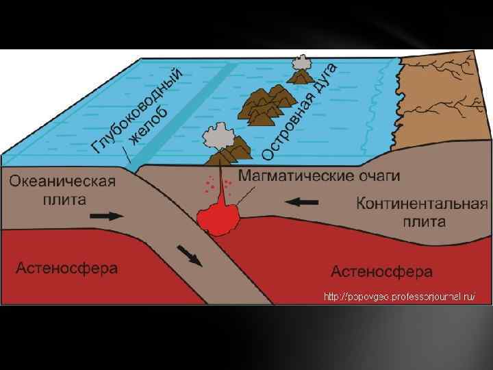 Конвергентные границы – границы, вдоль которых происходит столкновение плит. Главных вариантов взаимодействия при столкновении может быть три: «океаническая – океаническая» , «океаническая – континентальная» и «континентальная - континентальная» литосфера. В зависимости от характера сталкивающихся плит, может протекать несколько различных процессов. Субдукция – процесс поддвига океанской плиты под континентальную или другую океаническую. Зоны субдукции имеют характерное строение: глубоководный желоб – вулканическая островная дуга – задуговый бассейн. Погружение субдуцирующей плиты в мантию трассируется очагами землетрясений, возникающих на контакте плит и внутри субдуцирующей плиты. Эта сейсмофокальная зона получила название зона Беньофа. Заварицкого. В зонах субдукции начинается процесс формирования новой континентальной коры.