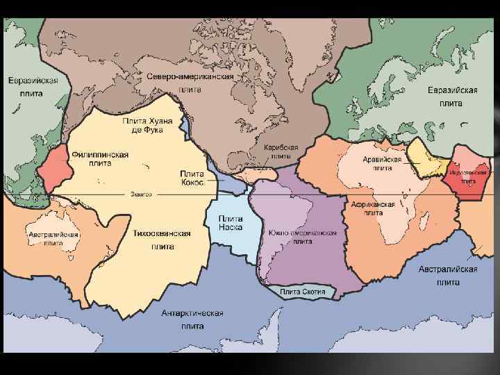 2. Литосфера разделена по плиты, постоянно движущиеся по поверхности пластичной астеносферы. Литосфера делится на 8 крупных плит, десятки средних плит и множество мелких. Между крупными и средними плитами располагаются пояса, сложенные мозаикой мелких коровых плит. Более 90 % поверхности Земли приходится на 8 крупных литосферных плит: Австралийская плита, Антарктическая плита, Африканская плита, Евразийская плита, Индостанская плита, Тихоокеанская плита, Северо-Американская плита, Южно-Американская плита. Средние плиты: Аравийская (субконтинент), Карибская, Филиппинская, Наска и Кокос и Хуан де Фука и др. . Некоторые литосферные плиты сложены исключительно океанической корой (например, Тихоокеанская плита), другие включают фрагменты и океанической и континентальной коры.