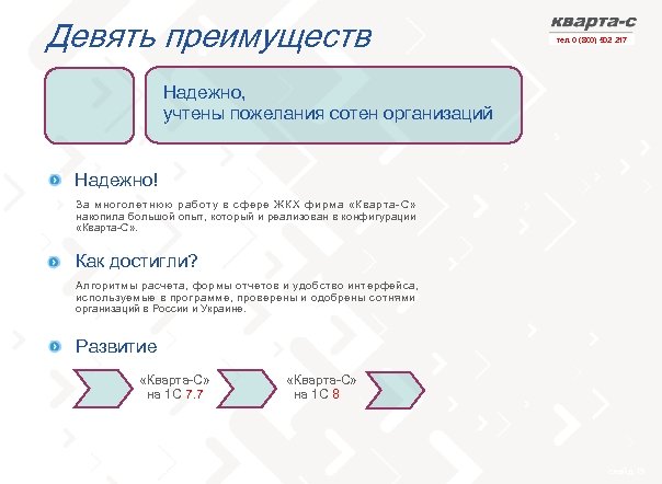 Девять преимуществ тел. 0 (800) 502 217 Надежно, учтены пожелания сотен организаций Надежно! За многолетнюю работу в сфере ЖКХ фирма «Кварта-С» накопила большой опыт, который и реализован в конфигурации «Кварта-С» . Как достигли? Алгоритмы расчета, формы отчетов и удобство интерфейса, используемые в программе, проверены и одобрены сотнями организаций в России и Украине. Развитие «Кварта-С» на 1 С 7. 7 «Кварта-С» на 1 С 8 слайд 19