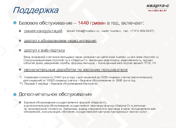 Поддержка тел. 0 (800) 502 217 Базовое обслуживание – 1440 гривен в год, включает: линия консультаций (email: hline@kvarta-c. ru, cкайп: kvarta-c, тел. : +7 812 609 09 67) доступ к обновлениям через интернет доступ к web-порталу Ввод показаний счетчиков жильцами через интернет на сайте www. kvarta-c. ru или www. mycondo. ru Синхронизация www. mycondo. ru и «Кварты-С» : квитанции квартплаты, задолженность, журнал событий дома, аварийная служба, форумы жильцов, - полноценный web-портал вашего ТСЖ, УК. незначительные доработки по желанию пользователя *) Указанная стоимость (1440 грн в год) – для лицензий до 3000 лицевых счетов (включительно); для лицензий от 10000 лицевых счетов – базовое обслуживание от 2880 грн в год. **) Первые 3 месяца – базовое обслуживание бесплатно. Дополнительное обслуживание Базовое обслуживание осуществляется фирмой «Кварта-С» , а дополнительное обслуживание осуществляют партнеры фирмы «Кварта-С» в регионах по произвольной стоимости. Например, выезд специалистов партнера в офис пользователя для обновлений, консультаций, обучения, осуществления настроек программы и прочих услуг. слайд 28