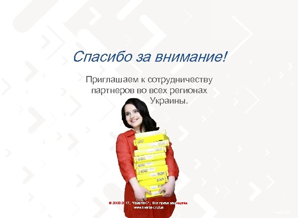 тел. 0 (800) 502 217 Спасибо за внимание! Приглашаем к сотрудничеству партнеров во всех регионах Украины. © 2008 -2017, "Кварта-С", Все права защищены. www. kvarta-c. ru/ua слайд 33