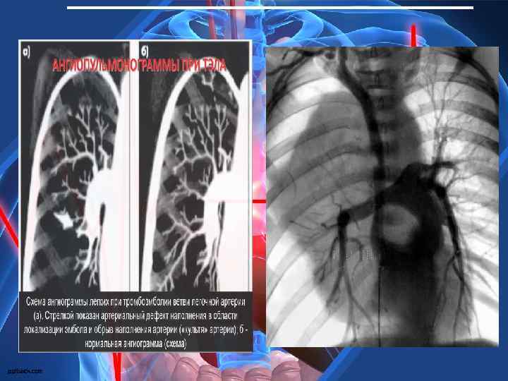 Селективна ангіопульмонографія є «золотим» стандартом діаг-ностики та дозволяє виявити: • збільшення діаметра ЛА; • повну або часткову відсутність контрастованих судин легені на боці ураження (“ампутація” тіні ЛА або її гілок – симптом “мертвого або обрубаного” дерева), залежно від рівня оклюзії; • деформацію легеневого рисунка