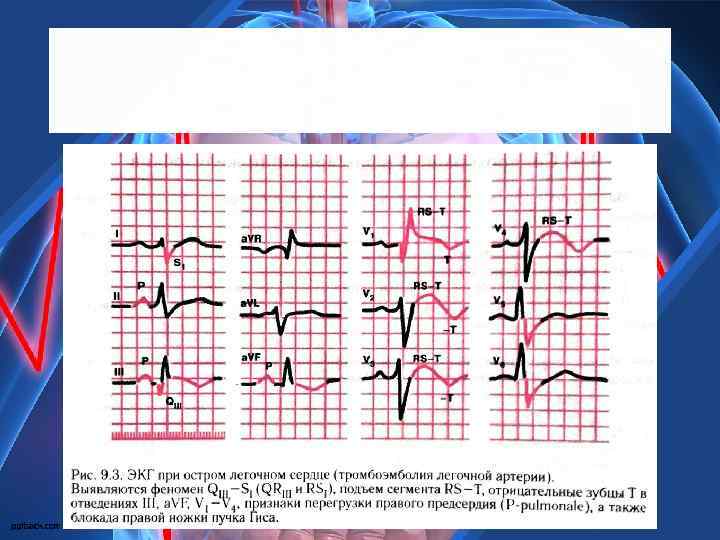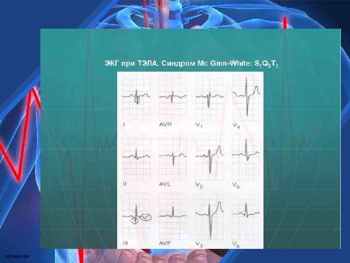 На ЕКГ відмічаються ознаки гострого ЛС • синдром Мак-Джина-Уайта (SIQIIIТІІІ); • переміщення перехідної зони вліво (глибокий SV 5 -6 у поєднанні з негативним ТV 1 -4, що пов’язано з різким підвищенням судинного опору і рівня тиску в малому колі кровообігу більш ніж 50 мм рт. ст. і характерно для масивних форм ТЕЛА). • депресія сегмента ST у відведеннях II, III, a. VF; • Р-pulmonale (Р загострений, висотою > 2 мм у ІІ-ІІІ, a. VF; ) • блокади правої ніжки пучка Гіса, AV-блокада, екстрасистолія, миготіння передсердь, шлуночкова тахікардія, фібриляція шлуночків, синусова тахікардія.