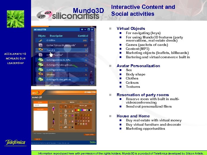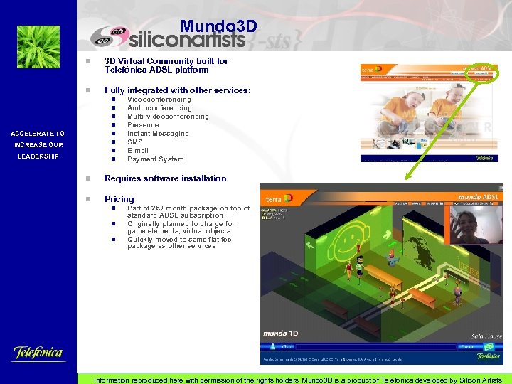 Mundo 3 D n 3 D Virtual Community built for Telefónica ADSL platform n Fully integrated with other services: n n n n ACCELERATE TO INCREASE OUR LEADERSHIP Videoconferencing Audioconferencing Multi-videoconferencing Presence Instant Messaging SMS E-mail Payment System n Requires software installation n Pricing n n n Part of 2€ / month package on top of standard ADSL subscription Originally planned to charge for game elements, virtual objects Quickly moved to same flat fee package as other services Telefónica I+D Information reproduced here with permission of the rights holders. Mundo 3 D is a product of Telefónica developed by Silicon Artists.