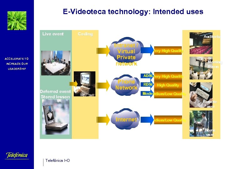 E-Videoteca technology: Intended uses Live event Coding Auditorium Intranet / Virtual Private network ACCELERATE TO INCREASE OUR Very High Quality Meeting Room LEADERSHIP Deferred event Stored lesson Phone Network ADSL Very High Quality RDSI High Quality Modem Medium/Low Quality Medium/ Remote user Internet Medium/Low Quality Medium/ Home user Telefónica I+D