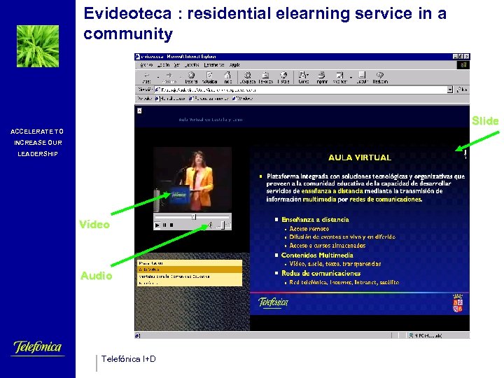 Evideoteca : residential elearning service in a community Slide ACCELERATE TO INCREASE OUR LEADERSHIP Vídeo Audio Telefónica I+D