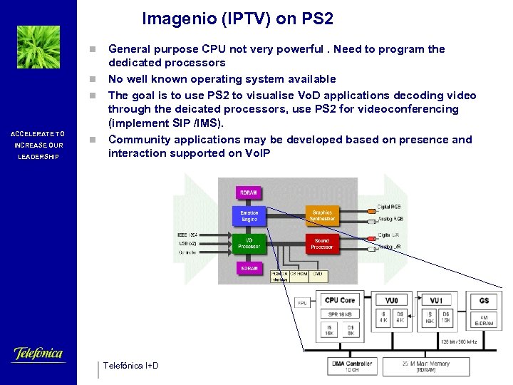 Imagenio (IPTV) on PS 2 n n n ACCELERATE TO INCREASE OUR LEADERSHIP n General purpose CPU not very powerful. Need to program the dedicated processors No well known operating system available The goal is to use PS 2 to visualise Vo. D applications decoding video through the deicated processors, use PS 2 for videoconferencing (implement SIP /IMS). Community applications may be developed based on presence and interaction supported on Vo. IP Telefónica I+D