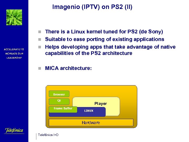 Imagenio (IPTV) on PS 2 (II) There is a Linux kernel tuned for PS 2 (de Sony) n Suitable to ease porting of existing applications n Helps developing apps that take advantage of native capabilities of the PS 2 architecture n ACCELERATE TO INCREASE OUR LEADERSHIP n MICA architecture: Browser Qt Frame Buffer Player LINUX Hardware Telefónica I+D