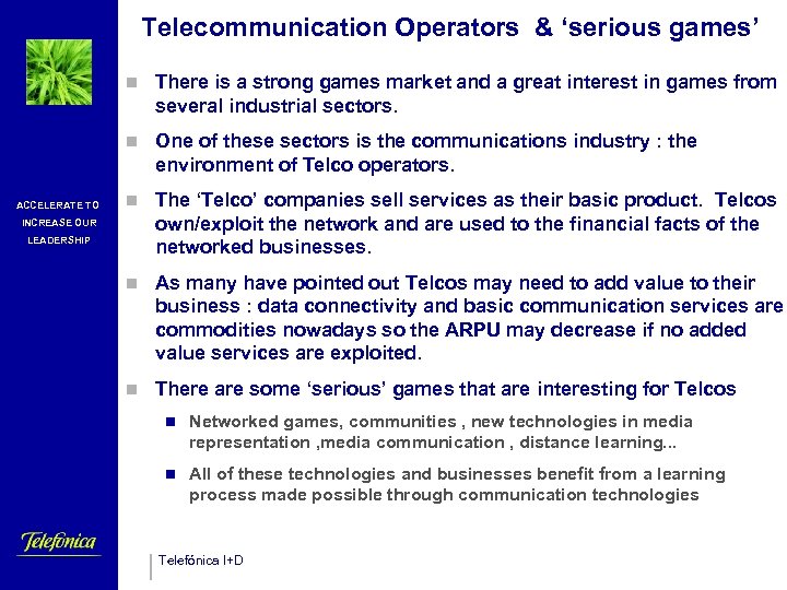 Telecommunication Operators & ‘serious games’ n n ACCELERATE TO There is a strong games market and a great interest in games from several industrial sectors. One of these sectors is the communications industry : the environment of Telco operators. n The ‘Telco’ companies sell services as their basic product. Telcos own/exploit the network and are used to the financial facts of the networked businesses. n As many have pointed out Telcos may need to add value to their business : data connectivity and basic communication services are commodities nowadays so the ARPU may decrease if no added value services are exploited. n There are some ‘serious’ games that are interesting for Telcos INCREASE OUR LEADERSHIP n Networked games, communities , new technologies in media representation , media communication , distance learning. . . n All of these technologies and businesses benefit from a learning process made possible through communication technologies Telefónica I+D