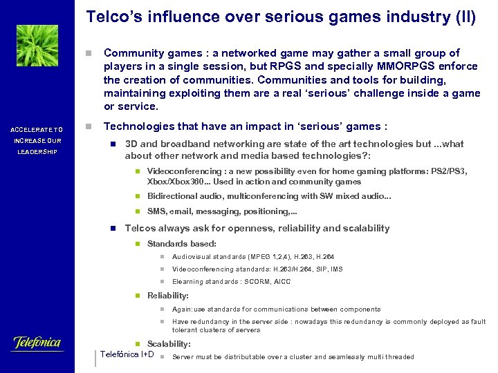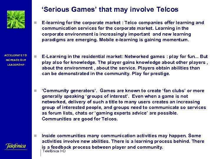 ‘Serious Games’ that may involve Telcos n ACCELERATE TO INCREASE OUR E-learning for the corporate market : Telco companies offer learning and communication services for the corporate market. Learning in the corporate environment is increasingly important and new learning paradigms are emerging. Mobile e-learning is gaining momentum. n E-Learning in the residential market: Networked games : play for fun. . . But play also for knowledge. The player gains knowledge about other players , about the environment , about the service. Players obtain abilities than can be demonstrated in the community. Play for prestige. n ‘Community generators’. Games are known to create ‘fan clubs’ or more generally speaking ‘groups of interest’. Even when a game is not networked, delivery of such a title to many users creates an increasing group of interested people, and groups need to communicate so services as forum lists, chats or ‘gaming experts advice’ are possible. Communities are good for Telcos. n Inside communities many communication activities may happen. Some activities involve new abilities. There is a learning process behind. There is a feedback process between player and community. LEADERSHIP Telefónica I+D