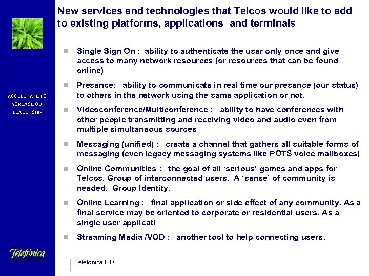 New services and technologies that Telcos would like to add to existing platforms, applications and terminals n Single Sign On : ability to authenticate the user only once and give access to many network resources (or resources that can be found online) n Presence: ability to communicate in real time our presence (our status) to others in the network using the same application or not. n Videoconference/Multiconference : ability to have conferences with other people transmitting and receiving video and audio even from multiple simultaneous sources n Messaging (unified) : create a channel that gathers all suitable forms of messaging (even legacy messaging systems like POTS voice mailboxes) n Online Communities : the goal of all ‘serious’ games and apps for Telcos. Group of interconnected users. A ‘sense’ of community is needed. Group Identity. n Online Learning : final application or side effect of any community. As a final service may be oriented to corporate or residential users. As a single user applicati n Streaming Media /VOD : another tool to help connecting users. ACCELERATE TO INCREASE OUR LEADERSHIP Telefónica I+D