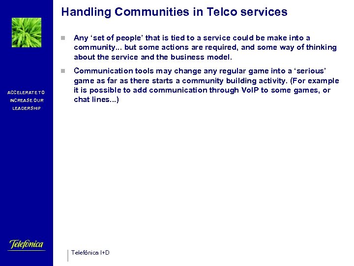 Handling Communities in Telco services n n ACCELERATE TO INCREASE OUR Any ‘set of people’ that is tied to a service could be make into a community. . . but some actions are required, and some way of thinking about the service and the business model. Communication tools may change any regular game into a ‘serious’ game as far as there starts a community building activity. (For example it is possible to add communication through Vo. IP to some games, or chat lines. . . ) LEADERSHIP Telefónica I+D