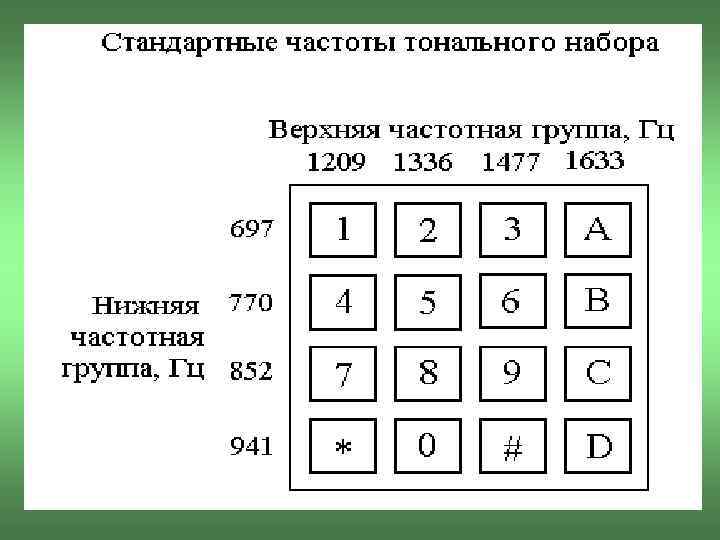 Как происходит набор • • 2 частоты подаются для 1 клавиши. DTMF – Dual Tone Multi Frequency (двухтонный многочастотный) Преимущества 1. Позвол. ? ? ? ? передачи данных. 2. Частоты такие, чтобы избежать гармонические помехи от речевых сигналов. 3. Макс. Скорость передачи номера ≈ в 3 раза > чем при импульсном наборе.