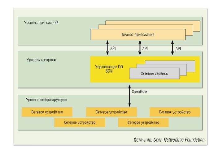 SDN Software-Defined Networking • Согласно концепции SDN, вся логика управления выносится в так называемые контроллеры, которые способны отслеживать работу всей сети • SDN позволит программировать сеть как единое целое • Характеристики сети можно оперативно изменять в режиме реального времени • протокол Open. Flow обеспечивает взаимодействие контроллера с сетевыми устройствами