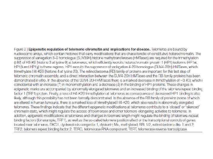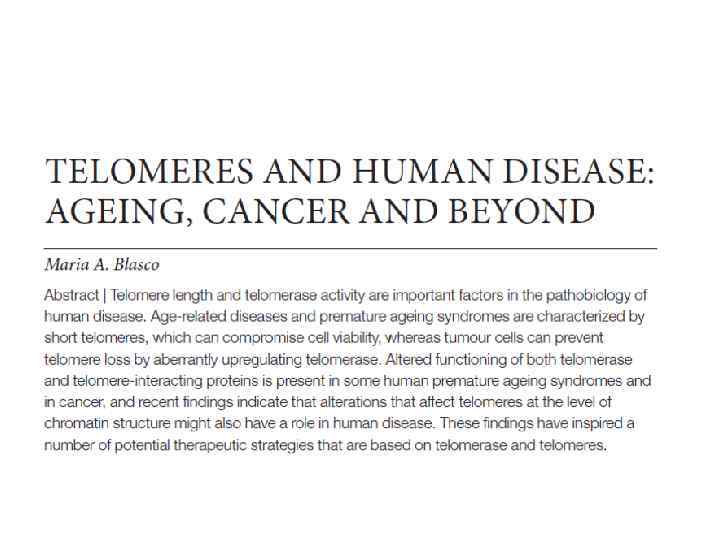 Telomerase and Aging Shorter telomeres 3. 2 fold higher mortality rate from heart disease 8. 5 fold higher mortality rate from infectious disease Cawthon et al, 2003