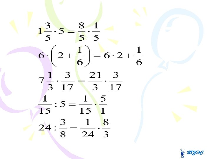 • Произведение обыкновенных дробей – это дробь, числитель которой равен произведению числителей, а знаменатель – произведению знаменателей данных дробей. • При умножении смешанных чисел их надо сначала превратить в неправильные дроби.