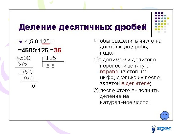 Деление десятичной дроби на десятичную дробь 24, 704: 0, 64=2470, 4: 64 64 2470, 4 192 38, 6 550 512 384 0