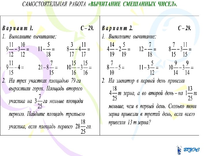 Решите примеры: 1 вариант: 1. 0, 18+0, 38= 2. 28, 354+0, 848= 3. 117, 44 -26, 56= 4. 21, 782 – 0, 29= 5. 4, 5 * 16 = 6. 7 * 18, 36= 7. 394, 2 : 9= 8. 4, 32 : 27= 2 вариант: 1. 2. 3. 4. 5. 6. 7. 8. 10, 91+15, 09= 0, 208+3, 912= 52, 7 -0, 728= 12, 36 – 4, 45= 4, 8 * 45 = 9 * 14, 55= 261, 6 : 8= 4, 8 : 32=