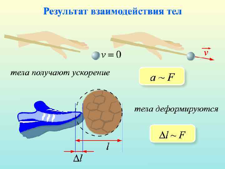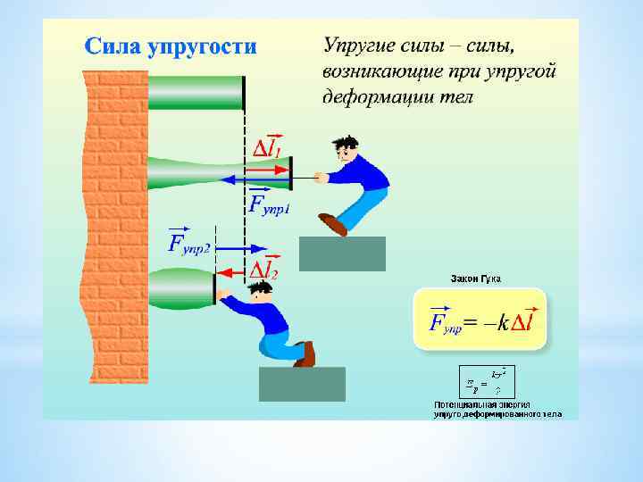 Сила упругости Силы, возникающие в результате деформации тел, называются силами упругости. При малых деформациях стальной пружины сила упругости прямо пропорциональна деформации (закон Гука): В данном примере сила упругости направлена противоположно силе тяжести. Ø k - называется жесткостью пружины; [k]=1 Н/м. Ø знак «минус» указывает на то, что сила упругости направлена противоположно деформации тела;