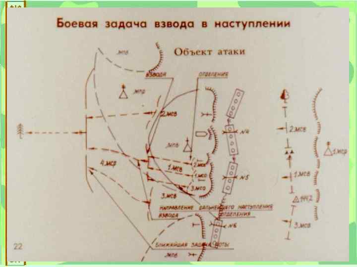 МСВ в наступлении Мотострелковый взвод может наступать в составе роты, в резерве батальона, в штурмовой группе, в боевом разведывательном дозоре и самостоятельно. Кроме этого мотострелковый взвод может действовать в передовой группе тактического воздушного десанта. Взвод наступает на фронте до 300 м, в мотострелковое отделение в пешем порядке – на фронте до 50 м. м Боевая задача взводу определяется замыслом боя старшего командира, характером обороны противника, степенью его поражения и наличием средств усиления. Мотострелковому взводу могут придаваться пулеметное отделение, автоматические гранатометы и огнеметы. Боевая задача мсв: мотострелковому взводу в наступлении указывается объект атаки и направление продолжения наступления. При постановке боевой задачи по радио взводу может быть указано только направление продолжения наступления. Объектом атаки мотострелкового взвода обычно является противник в окопах или в других фортификационных сооружениях опорного пункта, а также отдельно расположенные на направлении наступления танки, орудия, пулеметы и другие огневые средства противника.