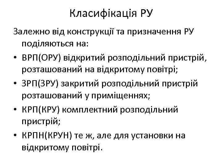 Класифікація РУ Залежно вiд конструкцiї та призначення РУ подiляються на: • ВРП(ОРУ) вiдкритий розподiльний пристрiй, розташований на вiдкритому повiтрi; • ЗРП(ЗРУ) закритий розподiльний пристрiй розташований у примiщеннях; • КРП(КРУ) комплектний розподiльний пристрiй; • КРПН(КРУН) те ж, але для установки на вiдкритому повiтрi.